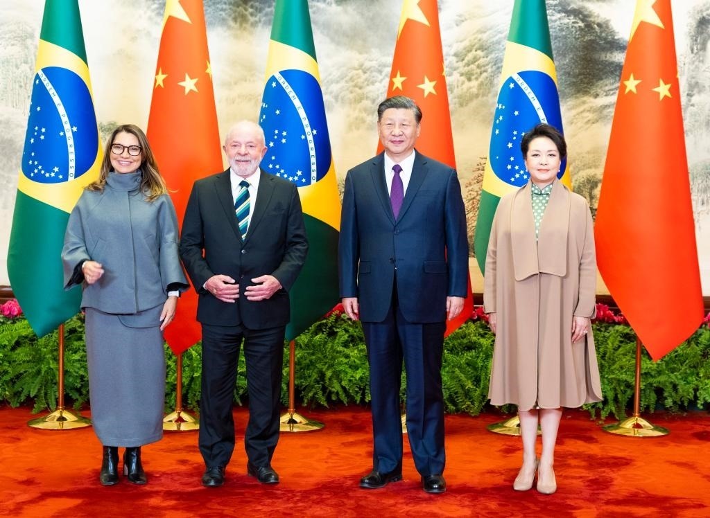 2023年4月14日下午,國家主席習(xí)近平在北京人民大會(huì)堂同來華進(jìn)行國事訪問的巴西總統(tǒng)盧拉舉行會(huì)談。這是會(huì)談前,習(xí)近平和夫人彭麗媛同盧拉和夫人羅桑熱拉合影。