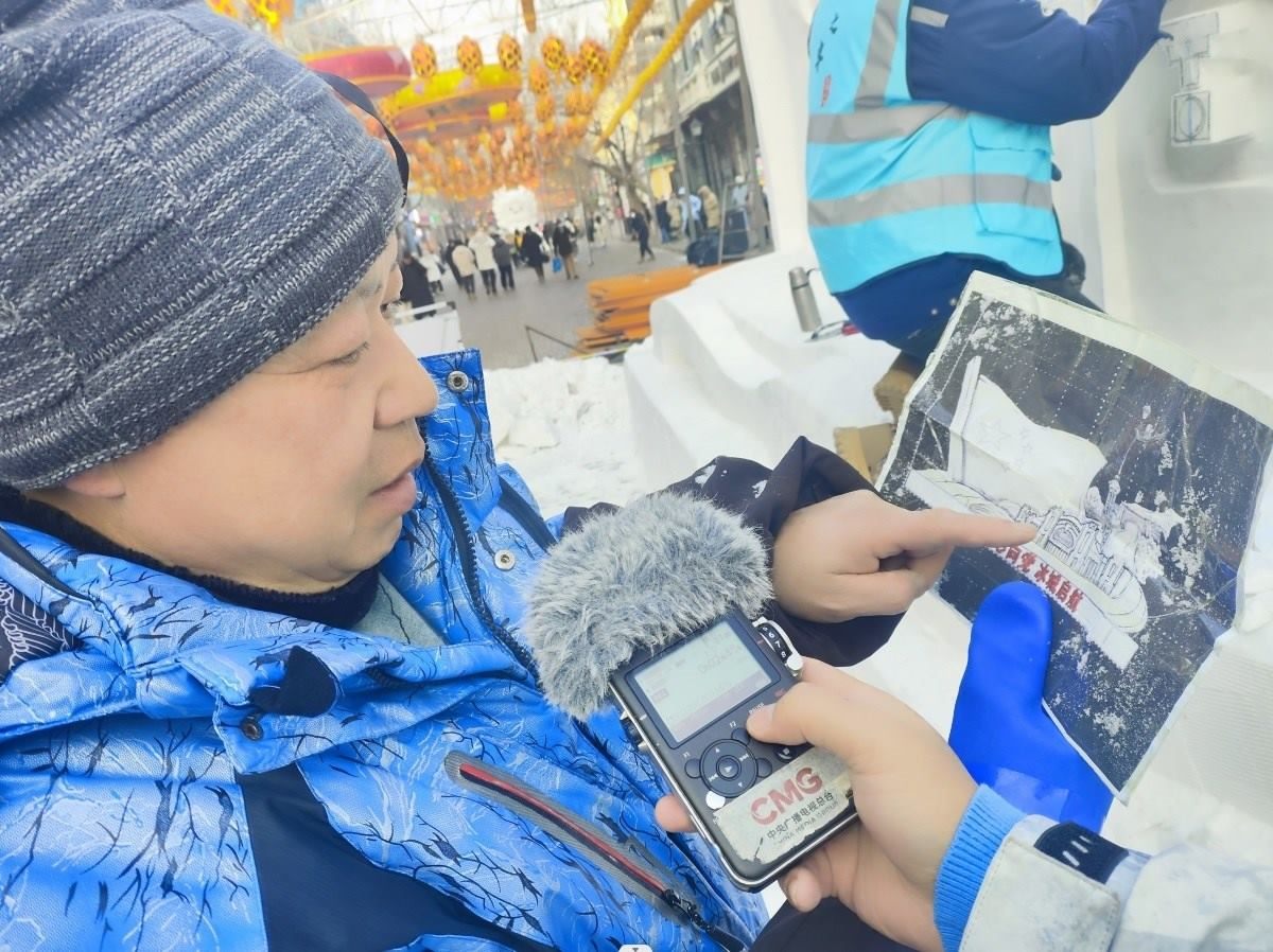 臧師傅向記者介紹在哈爾濱中央大街制作的另一個雪雕作品