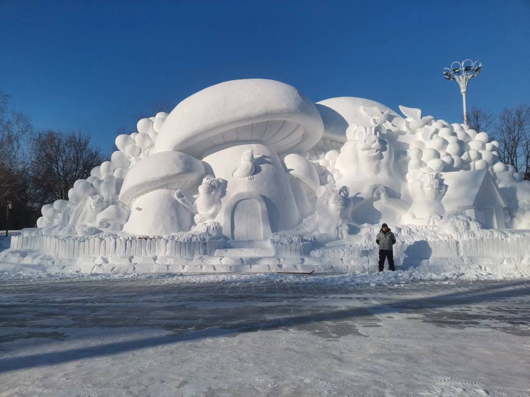 玉米圓潤飽滿,波光粼粼的浪花中,鯉魚躍出水面栩栩如生,背后高大的谷倉敦實可愛——晚上9點多,雪雕工具“搓板”完成了最后一搓,一座三米高,五米長,一輛卡車大小的雪雕作品終于完成,引來游客駐足拍照。