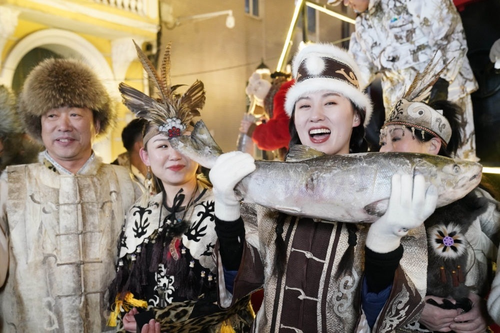 ↑1月6日,戴著魚(yú)皮頭飾的赫哲族姑娘在哈爾濱中央大街上參與家鄉(xiāng)推介活動(dòng)。