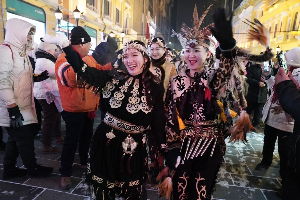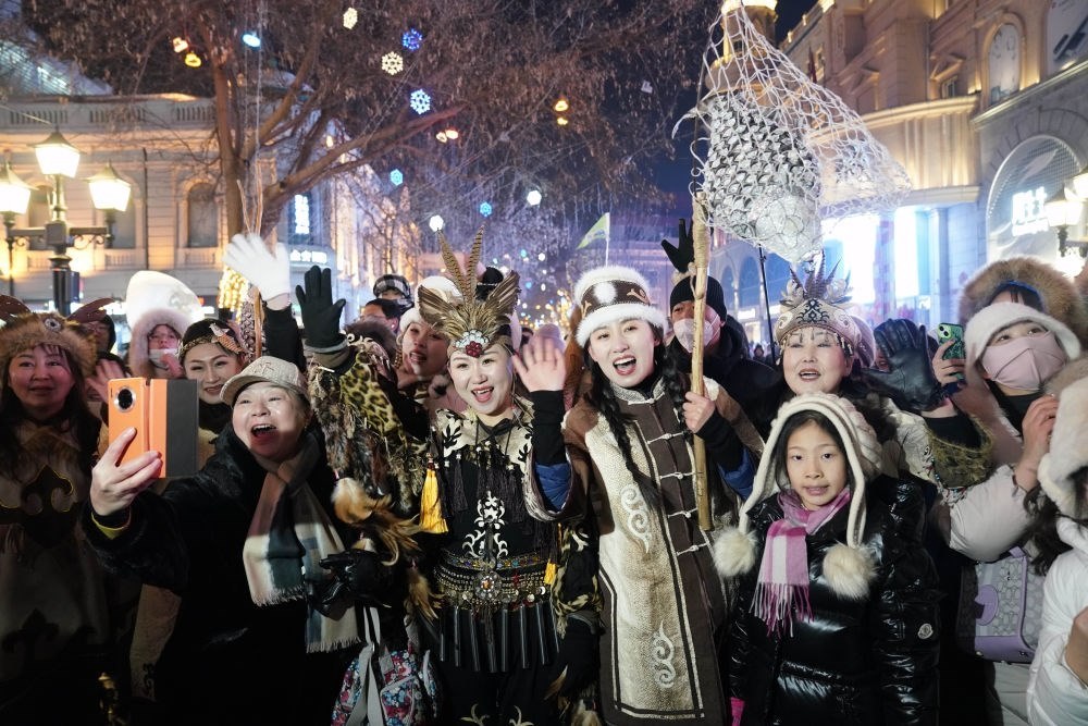 ↑1月6日,身著赫哲族服飾的赫哲族群眾和饒河縣文旅推薦官在哈爾濱中央大街上與游客互動(dòng)。