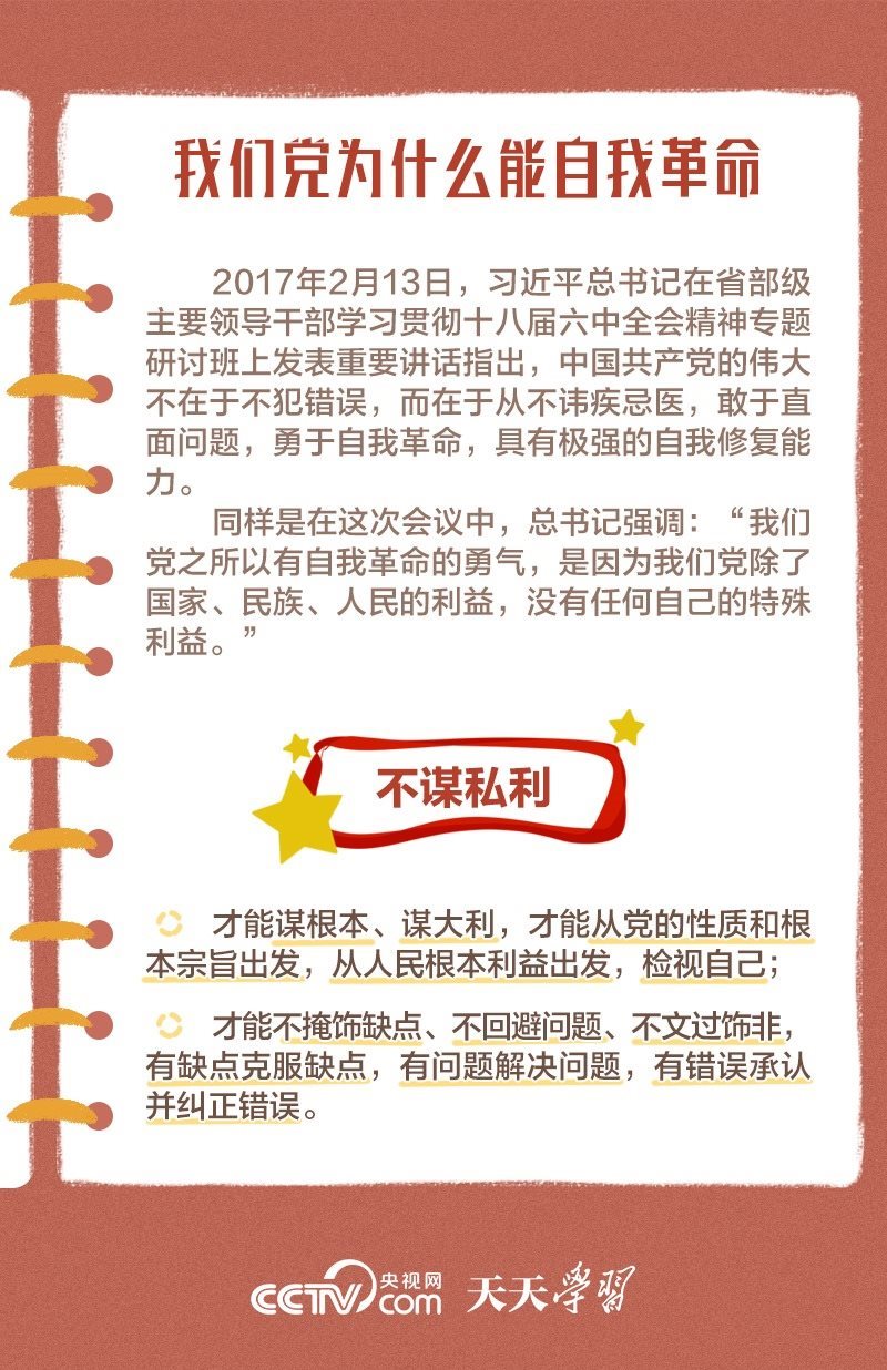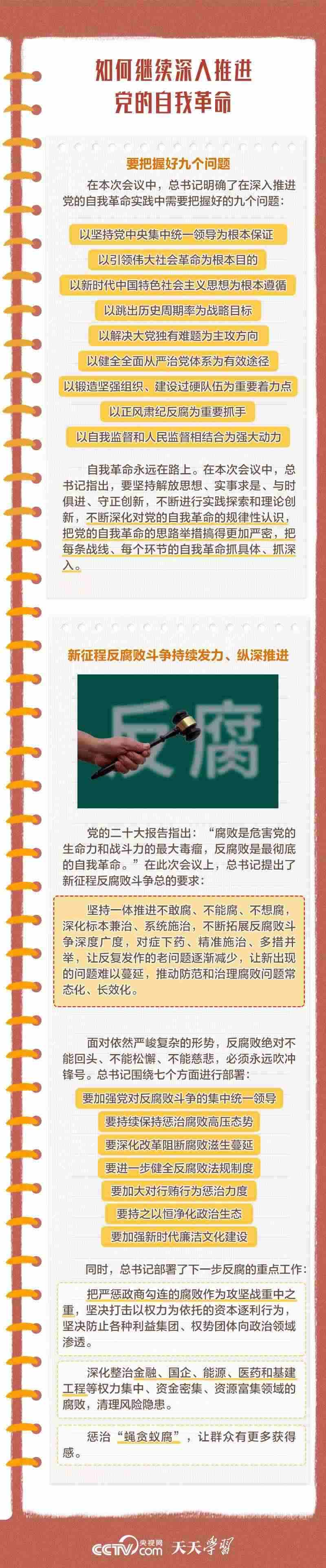 勇于自我革命是我們黨最鮮明的品格和最大的優(yōu)勢,總書記多次對推進黨的自我革命作出重要部署。此次會議上,總書記深刻闡述了黨的自我革命的重要思想,明確提出需要把握好九個問題,并對持續(xù)發(fā)力、縱深推進反腐敗斗爭作出戰(zhàn)略部署。央視網(wǎng)《天天學(xué)習(xí)》與您一起學(xué)習(xí)。