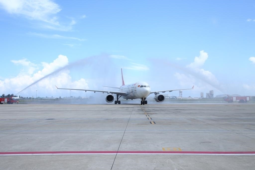 2023年1月18日,中國首都航空J(rèn)D455航班在馬爾代夫馬累維拉納國際機場接受水門禮。