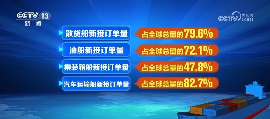 2023年全年數(shù)據(jù)顯示,全球18種主要船型中,我國(guó)有14種船型新接訂單位列全球第一,其中,散貨船、油船、集裝箱船和汽車(chē)運(yùn)輸船新接訂單量分別占全球總量的79.6%、72.1%、47.8%和82.7%。
