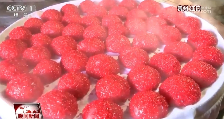 年貨寄托了人們對來年的美好期盼。貴州銅仁江口縣的“紅粑粑”寓意幸福美滿,每年春節(jié)前,當?shù)厝硕紩R聚一堂,制作圓圓的“紅粑粑”等待過年的到來。