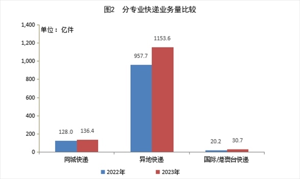 2023年,同城快遞業(yè)務(wù)量累計(jì)完成136.4億件,同比增長6.6%;異地快遞業(yè)務(wù)量累計(jì)完成1153.6億件,同比增長20.5%;國際/港澳臺快遞業(yè)務(wù)量累計(jì)完成30.7億件,同比增長52.0%。