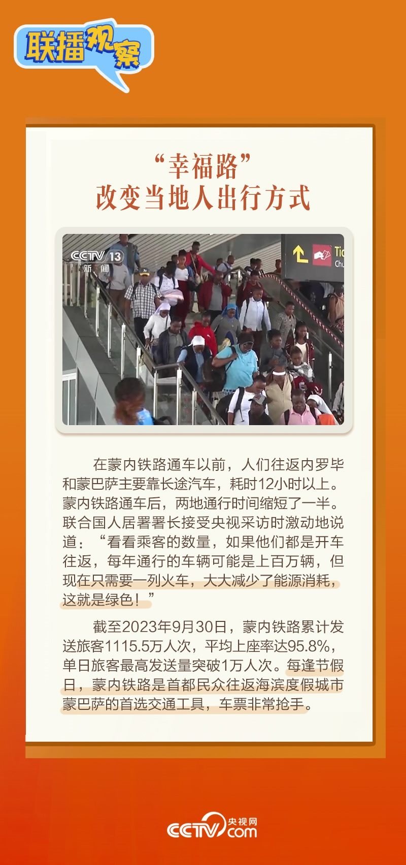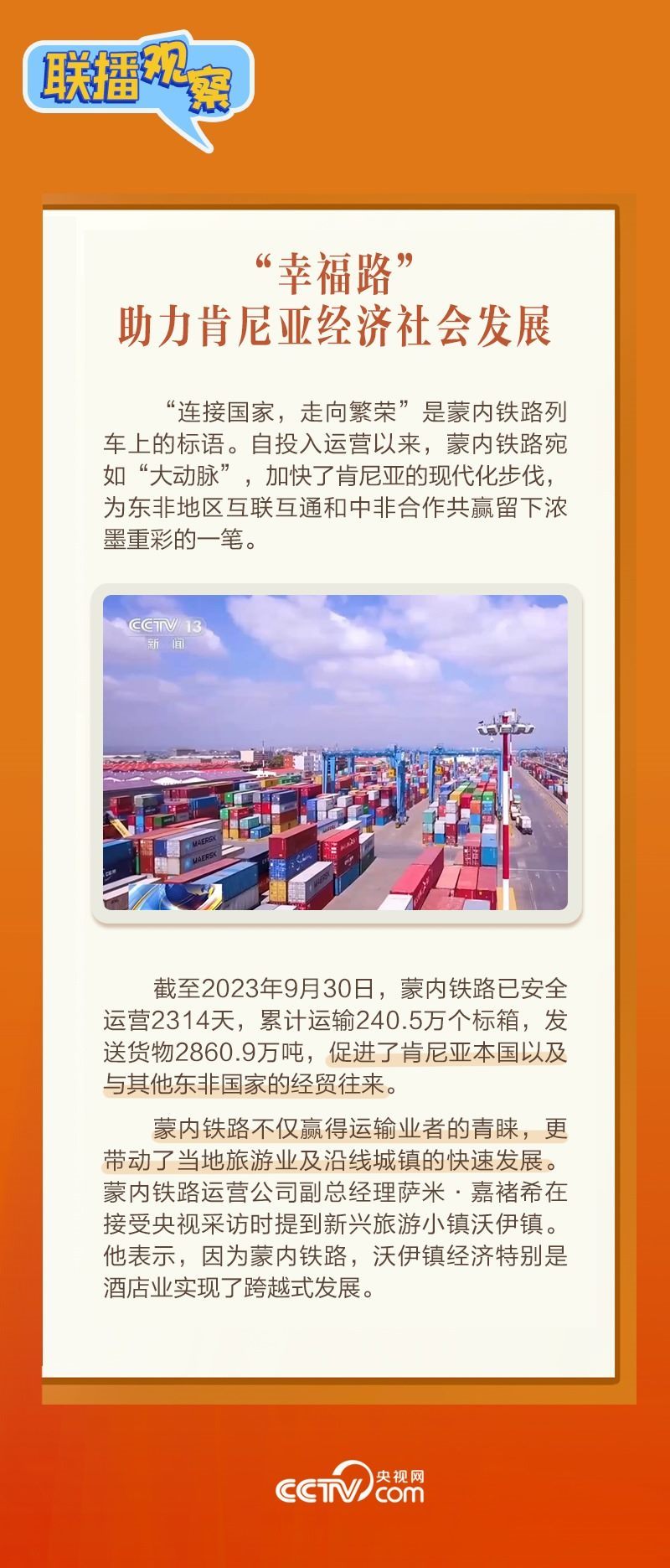 此前,習主席在外事活動中多次提及蒙內鐵路,《新聞聯播》也持續(xù)關注這條路的建設及開通后的運營情況。這條“幸福路”有何特別之處,習主席為何頻頻提及?它的建成通車給當地帶來哪些變化?《聯播觀察》邀您一同了解。
