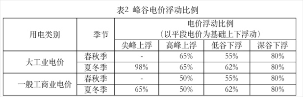 ?。ㄈ┱{(diào)整峰谷電價(jià)浮動比例,具體見表2。浮動比例以平段電價(jià)為基礎(chǔ),平段電價(jià)包含上網(wǎng)電價(jià)、上網(wǎng)環(huán)節(jié)線損費(fèi)用、系統(tǒng)運(yùn)行費(fèi)用、輸配電價(jià)(不含容(需)電價(jià))、政府性基金及附加。