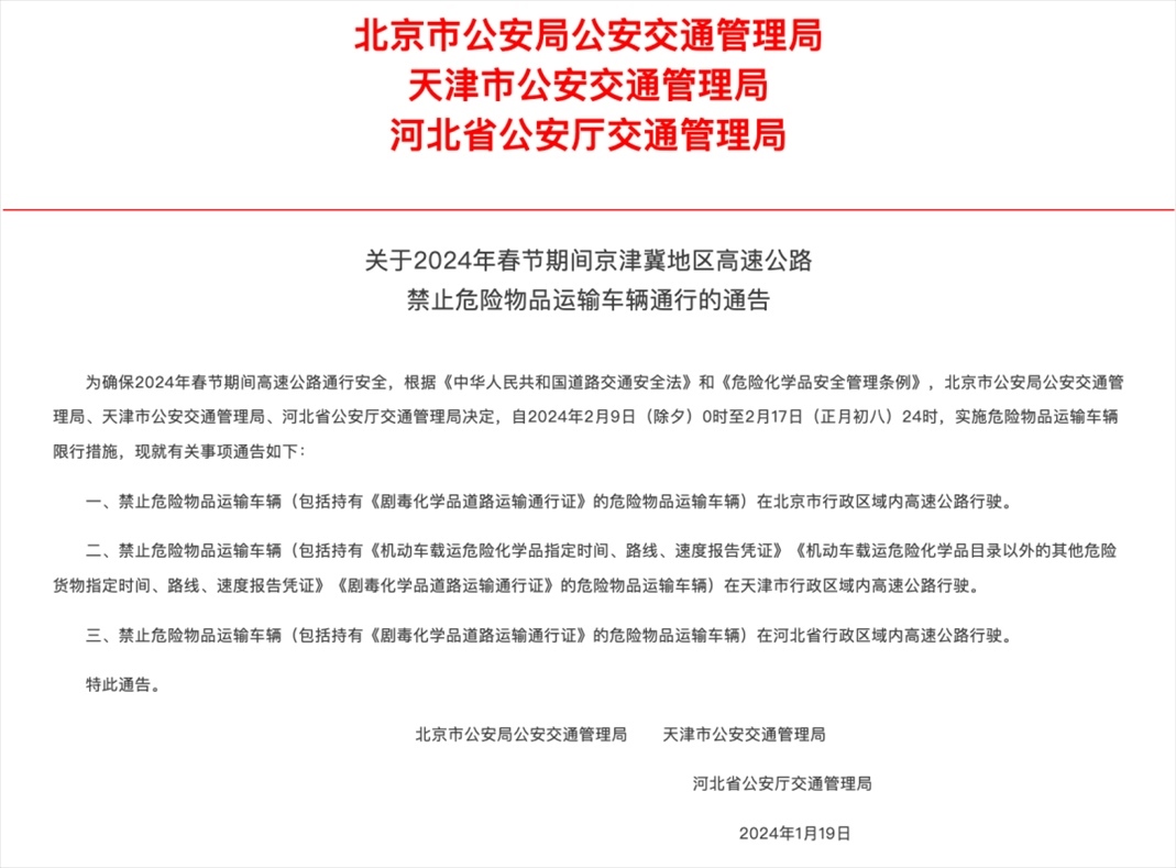 北京市公安局公安交通管理局、天津市公安交通管理局、河北省公安廳交通管理局決定,自2024年2月9日(除夕)0時至2月17日(正月初八)24時,實施危險物品運輸車輛限行措施,現就有關事項通告如下: