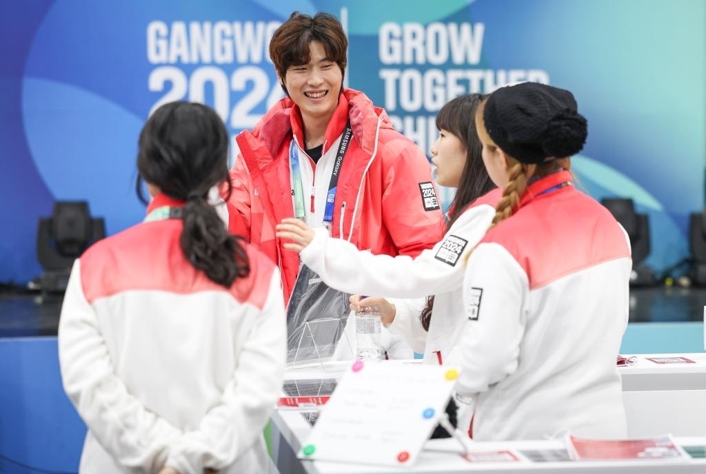 1月18日,志愿者在江原道冬青奧村內(nèi)交流。新華社記者 胡虎虎 攝