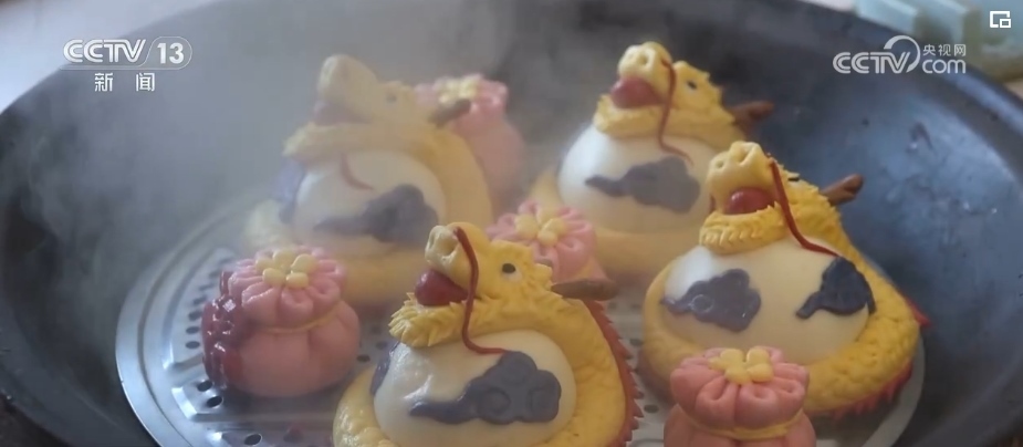 在黑龍江樺南縣,為了圖個(gè)熱鬧、沾個(gè)喜氣,誰(shuí)家蒸花饃,鄉(xiāng)里鄉(xiāng)親都會(huì)前來(lái)幫忙。在村民張瑞雪家里,大家圍坐在桌前,小小面團(tuán)通過“一印、二捏、三鑲”等技法,再起鍋開蒸,就變成了精美的龍年花饃。這些花饃形態(tài)各異,有的威武雄壯、有的憨態(tài)可掬,不僅外觀吸引人,更承載著美好的新年祝福。