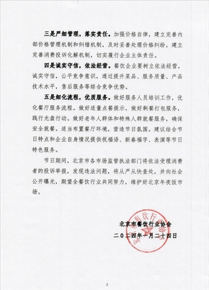 北京市餐飲行業(yè)協(xié)會就年夜飯市場發(fā)布倡議:嚴(yán)禁價格欺詐