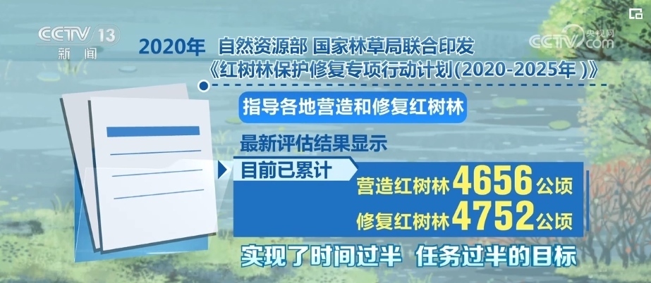 2020年,自然資源部、國家林草局聯(lián)合印發(fā)《紅樹林保護(hù)修復(fù)專項(xiàng)行動計劃(2020—2025年)》,指導(dǎo)各地營造和修復(fù)紅樹林。最新評估結(jié)果顯示,目前,已累計營造紅樹林4656公頃,修復(fù)紅樹林4752公頃,實(shí)現(xiàn)了時間過半、任務(wù)過半的目標(biāo)。
