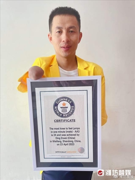 山東濰坊,42歲的丁二偉在8歲時(shí),因?yàn)檎{(diào)皮摸了村里的變壓器造成雙臂截肢。他當(dāng)了11年殘疾人長跑運(yùn)動員,退役已經(jīng)有10年了。2日,他收到吉尼斯總部寄來的證書,挑戰(zhàn)的項(xiàng)目是一分鐘跪跳起,他一分鐘跳了24個,是跪跳起跳得最多的人。