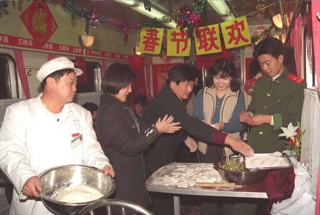2000年2月5日,天津開(kāi)往廣州的一列列車(chē)上,工作人員為旅客準(zhǔn)備了熱氣騰騰的餃子,還精心編排了豐富多彩的文藝節(jié)目。