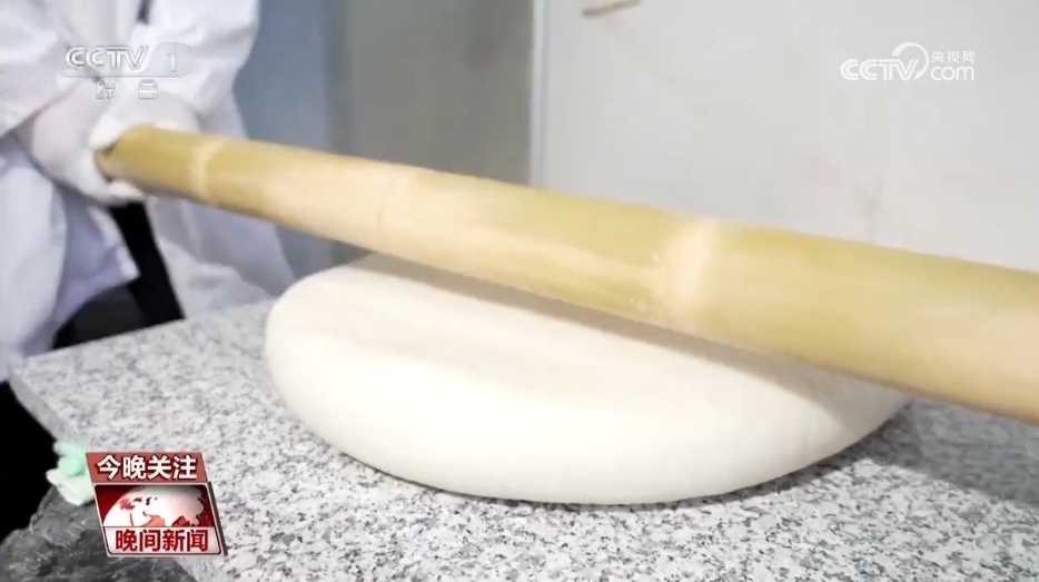 浙江省新昌縣日進(jìn)年糕加工廠負(fù)責(zé)人 王攀:我們用到的是定制的石頭和石臼,比如說(shuō)石錘的大小、粗細(xì)、重量各方面都是精確計(jì)算。搗制工藝又是傳統(tǒng)的,所以這是保持它原風(fēng)味最重要的東西。
