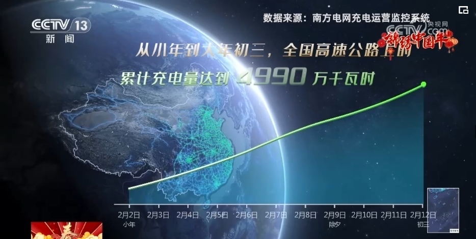 這個春節(jié),人們駕駛著新能源汽車,繪制出了一幅“綠色”的春節(jié)旅行軌跡圖。2.1萬個充電樁遍布各地的高速公路,從小年到大年初三,全國高速公路上的累計充電量達到4990萬千瓦時。