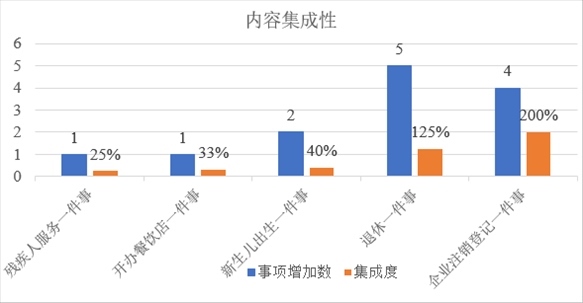 從內(nèi)容集成度看,5項(xiàng)相關(guān)“一件事”的事項(xiàng)集成比例均有不同程度提升?!皻埣踩朔?wù)一件事”增加1個(gè)事項(xiàng),集成度提升25%。“開(kāi)辦餐飲店一件事”增加1個(gè)事項(xiàng),集成度提升33%?!靶律鷥撼錾患隆痹黾?個(gè)事項(xiàng),集成度提升40%?!巴诵菀患隆痹黾?個(gè)事項(xiàng),集成度提升125%。“企業(yè)注銷登記一件事”增加4個(gè)事項(xiàng),集成度提升200%。
