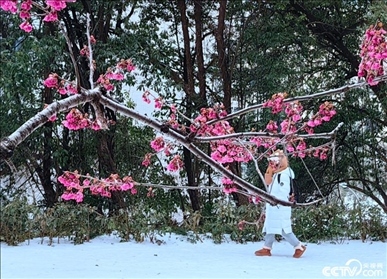 武漢大學(xué)早櫻雪中綻放,吸引眾人打卡拍照。
