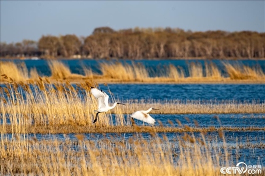 黑龍江齊齊哈爾,天氣回暖,一對白琵鷺來到扎龍自然保護區(qū)克欽湖濕地筑巢安家。