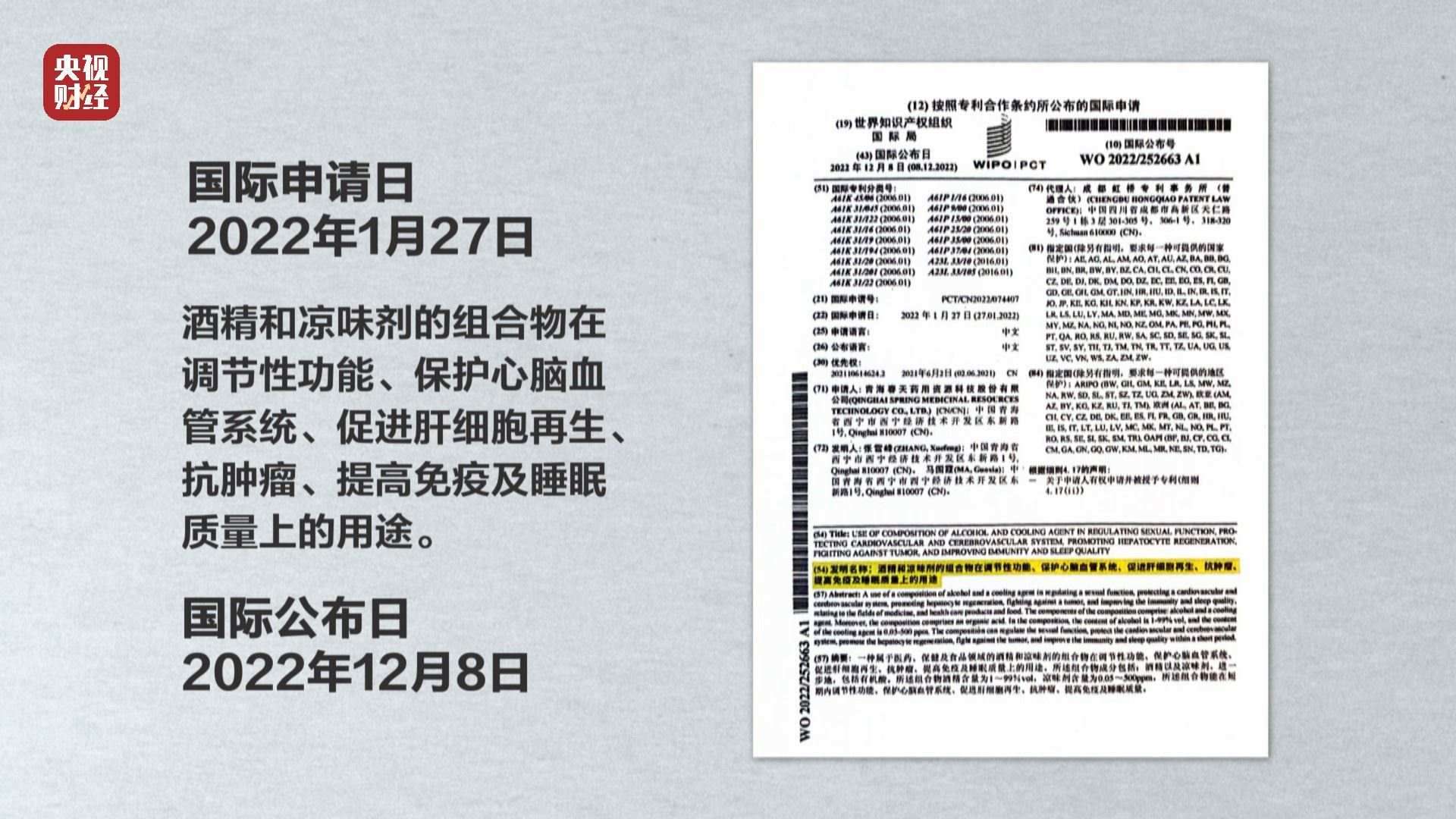 聽花酒業(yè)發(fā)展有限責任公司大區(qū)經(jīng)理:我們現(xiàn)在是在專利申請公布階段,這個國際知識產(chǎn)權組織在什么情況下才能把你這個申請公布呢,它已經(jīng)經(jīng)過試驗,證實這些數(shù)據(jù)是有效、真實的,就會把這個專利公布出來,因為聽花酒的健康價值是最值錢的。
