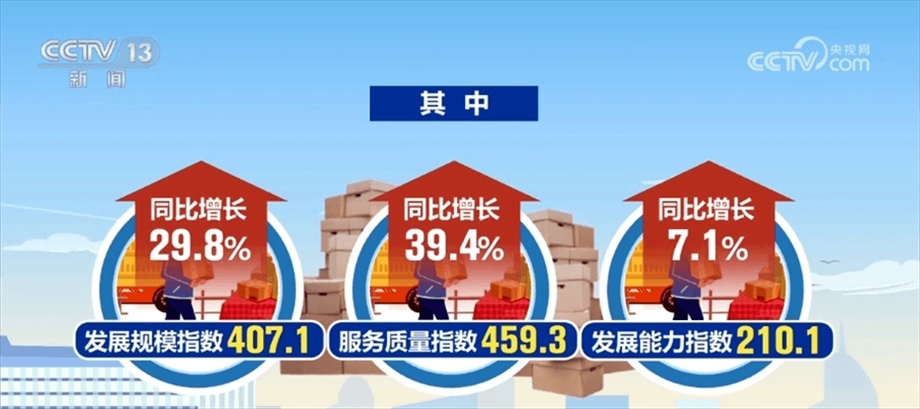 數(shù)據(jù)顯示,2024年1—2月中國(guó)快遞發(fā)展指數(shù)為329.6,同比提升26.7%。其中,發(fā)展規(guī)模指數(shù)、服務(wù)質(zhì)量指數(shù)和發(fā)展能力指數(shù)同比分別增長(zhǎng)29.8%、39.4%、7.1%,發(fā)展趨勢(shì)指數(shù)為66。