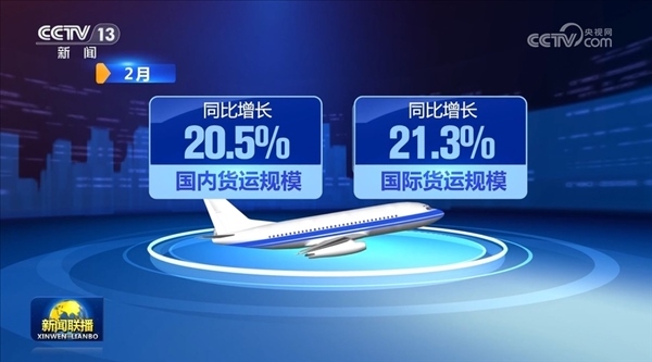 貨運方面,2月,全行業(yè)完成貨郵運輸量54.6萬噸,同比增長20.8%。其中,國內(nèi)、國際貨運規(guī)模同比分別增長20.5%、21.3%。1—2月貨郵運輸量達到歷年開年前兩月最高值。
