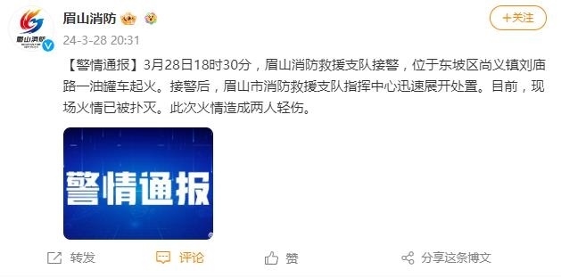 央視網(wǎng)消息:據(jù)眉山消防官微通報,3月28日18時30分,四川眉山消防救援支隊(duì)接警,位于東坡區(qū)尚義鎮(zhèn)劉廟路一油罐車起火。接警后,眉山市消防救援支隊(duì)指揮中心迅速展開處置。目前,現(xiàn)場火情已被撲滅。此次火情造成兩人輕傷。