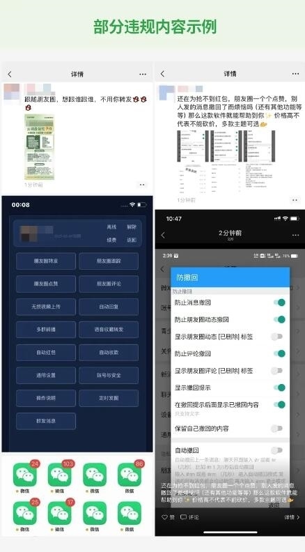 3月26日,微信安全中心發(fā)布《針對在微信使用“外掛”行為的打擊公告》,《公告》指出,根據(jù)《微信個(gè)人賬號使用規(guī)范》規(guī)定,微信明確禁止使用各類“外掛”。但近期發(fā)現(xiàn),有部分用戶存在多次違規(guī)使用“外掛”軟件,或在朋友圈發(fā)布“外掛”售賣信息的行為。對此,微信安全團(tuán)隊(duì)進(jìn)行了專項(xiàng)清理,并將持續(xù)加大清理力度。