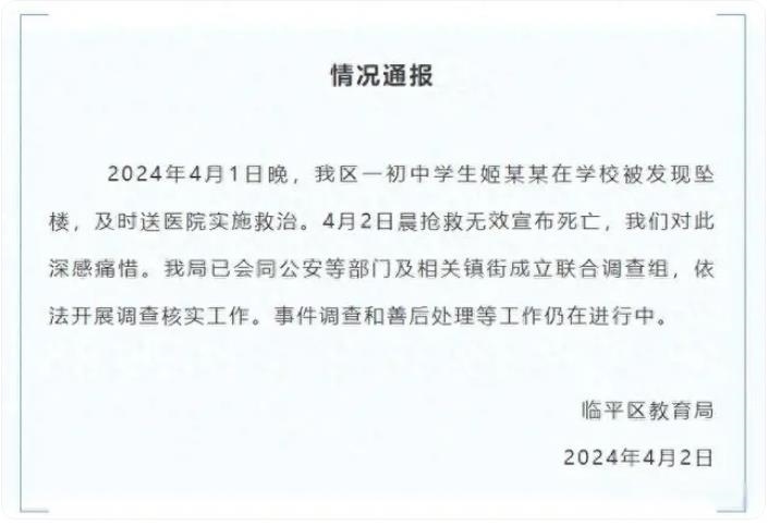 ·杭州臨平教育局通報“一初中學生在學校墜樓死亡”:成立聯合調查組。