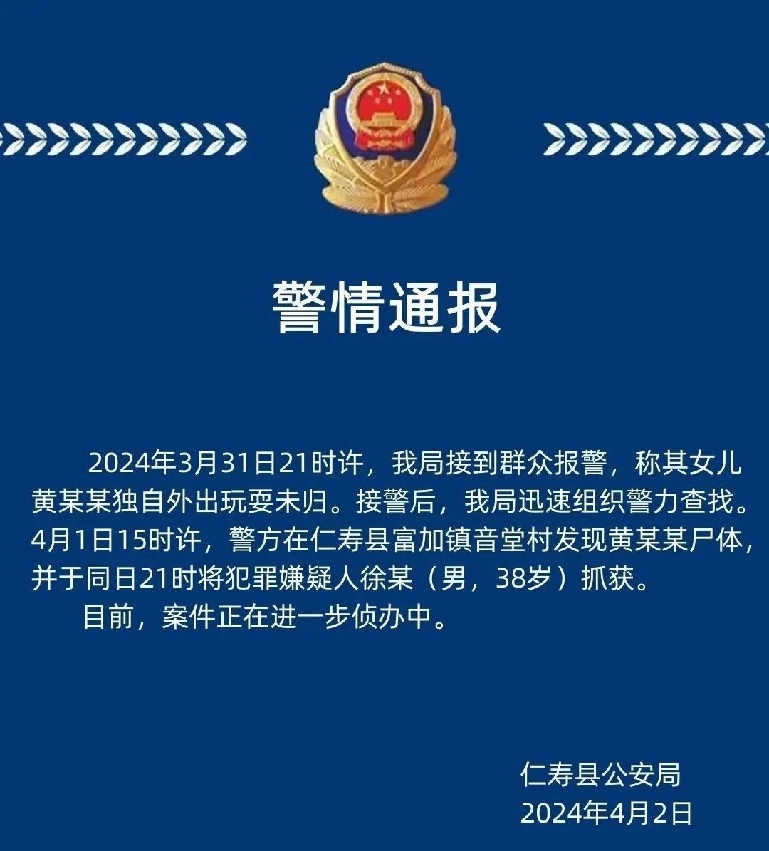 ·警方通報四川仁壽11歲女孩失蹤遇害:發(fā)現尸體,同日抓獲38歲嫌疑人。