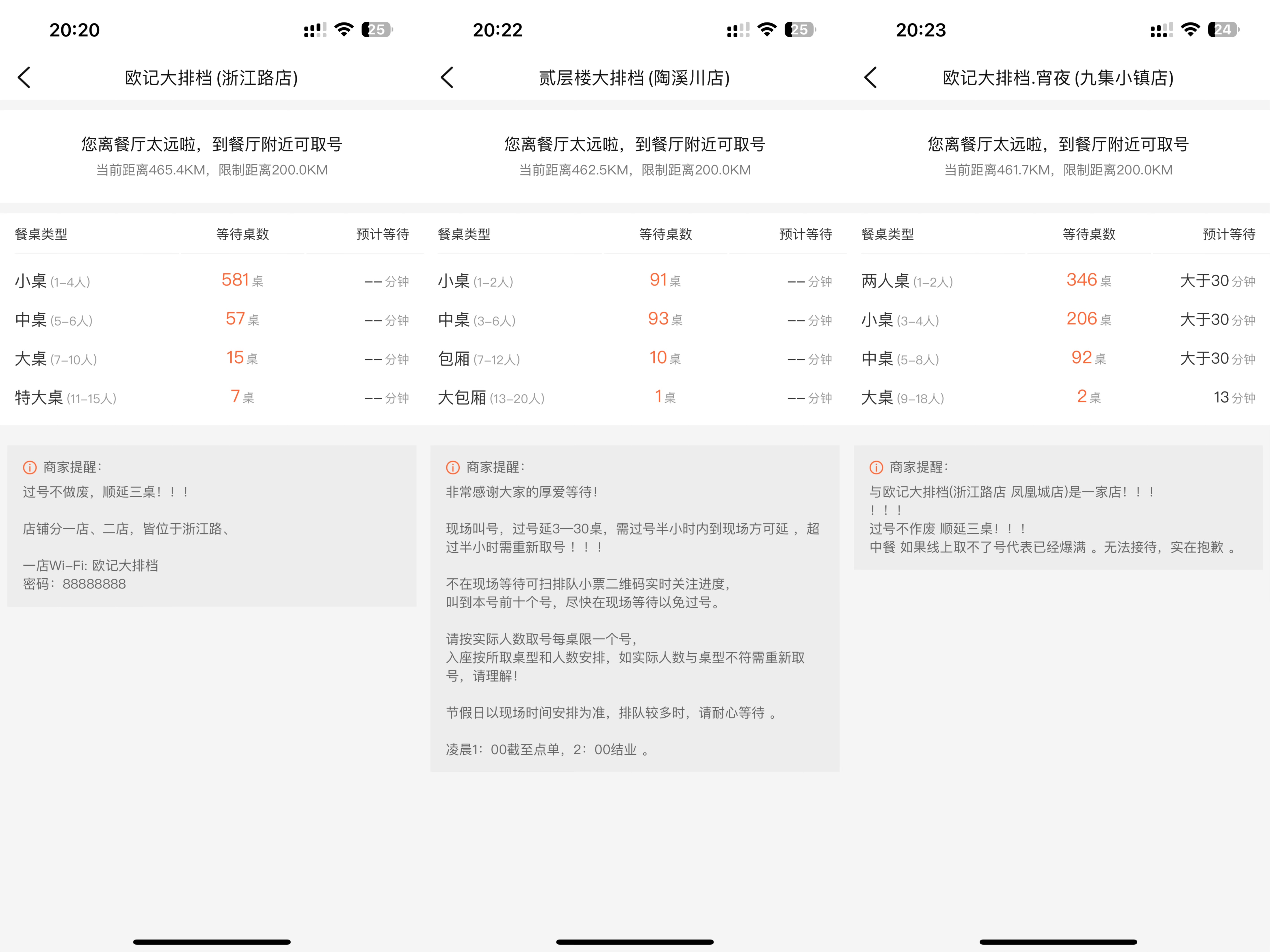 4月4日晚,澎湃新聞在大眾點評上搜索發(fā)現(xiàn),景德鎮(zhèn)多家餐廳爆滿。如截至當(dāng)日20:20,歐記大排檔浙江路店的小桌需等待581桌,中桌需等待57桌。截至當(dāng)日20:22,貳層樓大排檔陶溪川店的小桌需等待91桌,中桌需等待93桌。截至當(dāng)日20:23,歐記大排檔九集小鎮(zhèn)店的兩人桌需等待346桌,小桌需等待206桌,中桌需等待92桌。