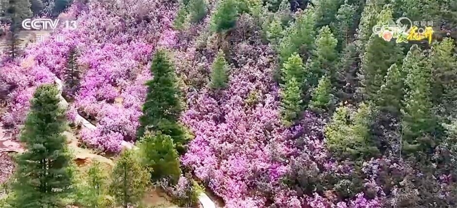 跟隨鏡頭,我們來到云南省怒江州蘭坪縣,在海拔2810米的啦井鎮(zhèn)期井村,漫山遍野的野生杜鵑花競相綻放。馬纓杜鵑、團(tuán)花杜鵑、假乳黃杜鵑、猴頭杜鵑……山谷里、山坡上,紅的、粉的、黃的,層層疊疊開滿枝頭,隨著山勢起伏跌宕,仿佛浪潮一般,形成了天然的花海。