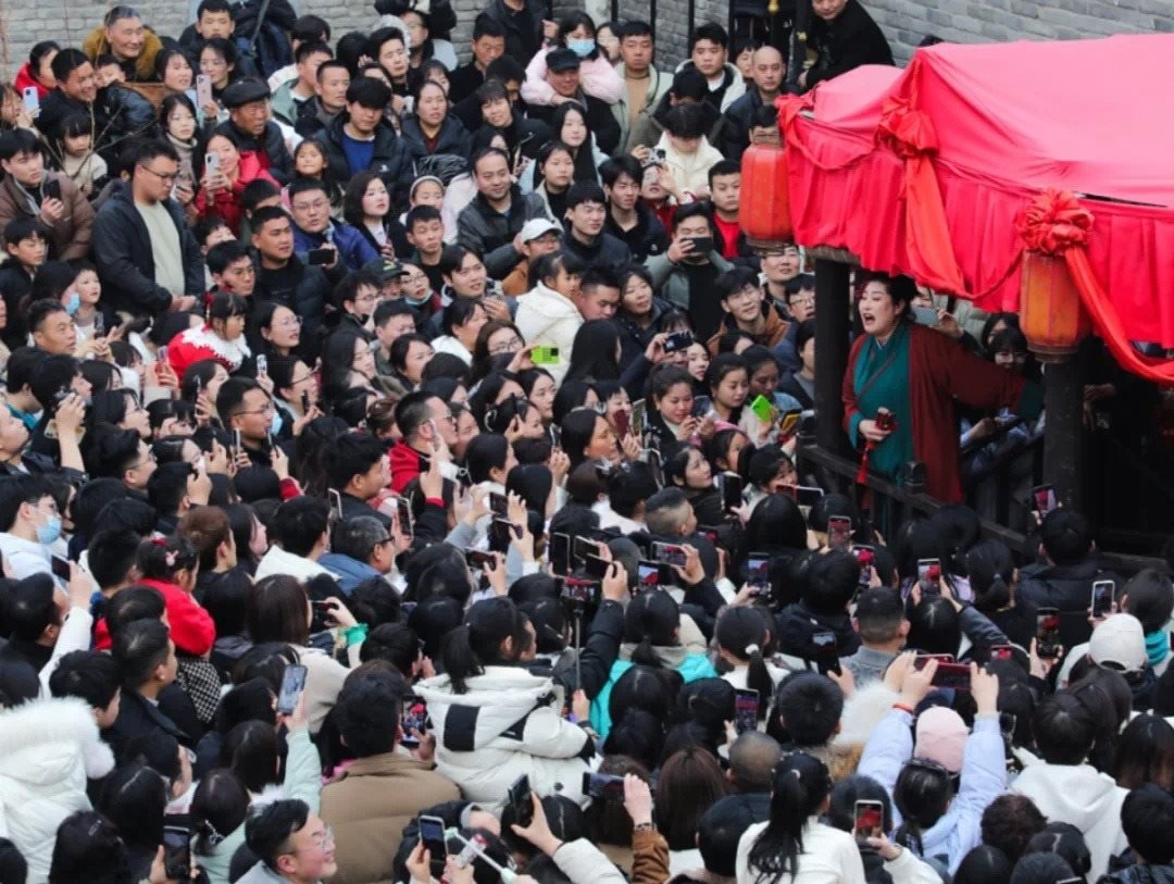 這個(gè)春日,午后的萬(wàn)歲山武俠城景區(qū)水滸街王婆茶館前,熙熙攘攘的人群包圍了舞臺(tái)三面,每個(gè)能看到臺(tái)上的縫隙都被填滿,水泄不通,一旁茶樓二層的好位置已早早被預(yù)訂,有人不遠(yuǎn)千里只為一睹真容。