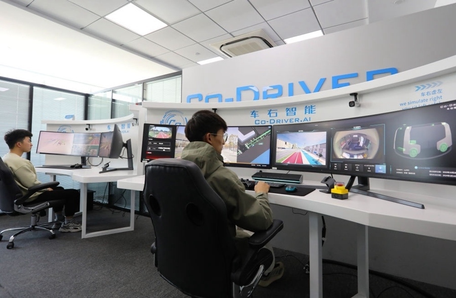 在位于中國(guó)(上海)自由貿(mào)易試驗(yàn)區(qū)臨港新片區(qū)的一家智能駕駛企業(yè),工作人員通過(guò)無(wú)人駕駛汽車(chē)遠(yuǎn)程監(jiān)管平臺(tái)的實(shí)時(shí)畫(huà)面,結(jié)合電子地圖對(duì)在自動(dòng)駕駛測(cè)試專(zhuān)用路上行駛的車(chē)輛進(jìn)行監(jiān)管(2024年4月9日攝)。