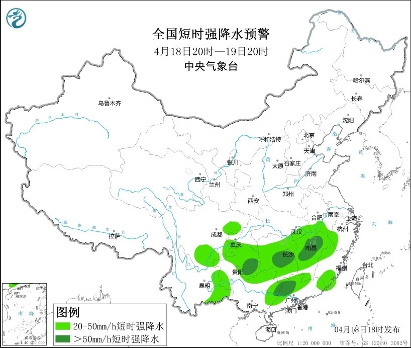 預(yù)計4月18日20時至19日20時,貴州中東部、湖南中南部、江西、浙江西南部、廣西北部、廣東北部、福建南部等地的部分地區(qū)將有8-10級雷暴大風或冰雹天氣,其中貴州東部、湖南中南部、江西中北部、廣西東北部、廣東北部等地的部分地區(qū)將有10級以上雷暴大風,局地風力可達11級以上;四川東部和南部、重慶南部、貴州、湖北東南部、安徽南部、湖南、江西、浙江西部、福建西北部和南部、云南東南部、廣西東北部、廣東北部等地將有小時雨量大于20毫米的短時強降水天氣,其中貴州東部、湖南中南部、江西中部、廣東中北部等地的部分地區(qū)最大小時雨量大于50毫米,局地可達70毫米以上。