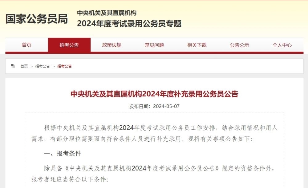 根據(jù)中央機關(guān)及其直屬機構(gòu)2024年度考試錄用公務(wù)員工作安排,結(jié)合錄用情況和用人需求,有部分職位需要面向符合條件人員進行補充錄用?,F(xiàn)將有關(guān)事項公告如下: