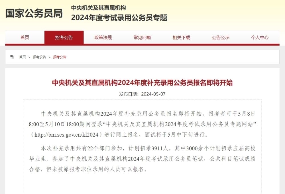 本次補充錄用共有22個部門參加,計劃招錄3911人,其中3000余個計劃招錄應(yīng)屆高校畢業(yè)生。參加了中央機關(guān)及其直屬機構(gòu)2024年度考試錄用公務(wù)員筆試,公共科目筆試成績合格,但未被原報考職位錄用的人員可以報名。