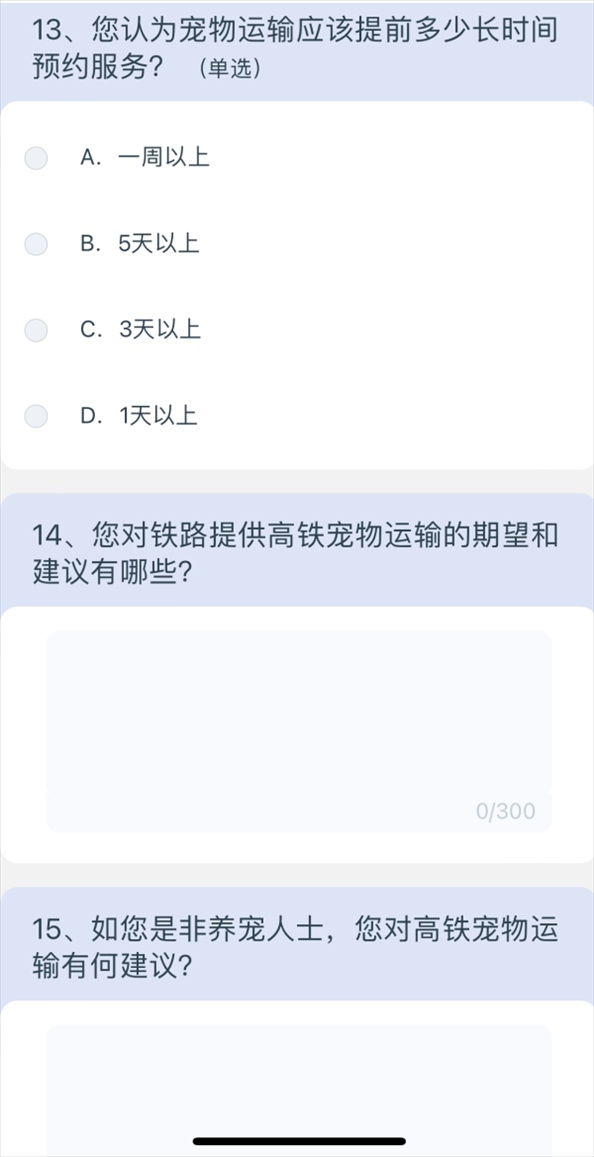 5月10日上午8點(diǎn)40分,澎湃新聞記者通過掃描網(wǎng)友分享的列車上的二維碼,進(jìn)入12306系統(tǒng),選擇問卷·建議,進(jìn)入“鐵路旅客高鐵寵物運(yùn)輸”調(diào)查,共15個問題,涉及養(yǎng)寵類型、是否有攜帶寵物出行的需求、如果鐵路提供寵物運(yùn)輸服務(wù)是否愿意嘗試等,以及為降低對其他旅客的影響,在高鐵寵物運(yùn)輸更關(guān)注哪方面的防護(hù);如鐵路提供高鐵寵物運(yùn)輸服務(wù),期望的定價標(biāo)準(zhǔn);如鐵路提供高鐵寵物運(yùn)輸服務(wù),最關(guān)注的內(nèi)容;如果是非養(yǎng)寵人士,對高鐵寵物運(yùn)輸有何建議等多方面問題。