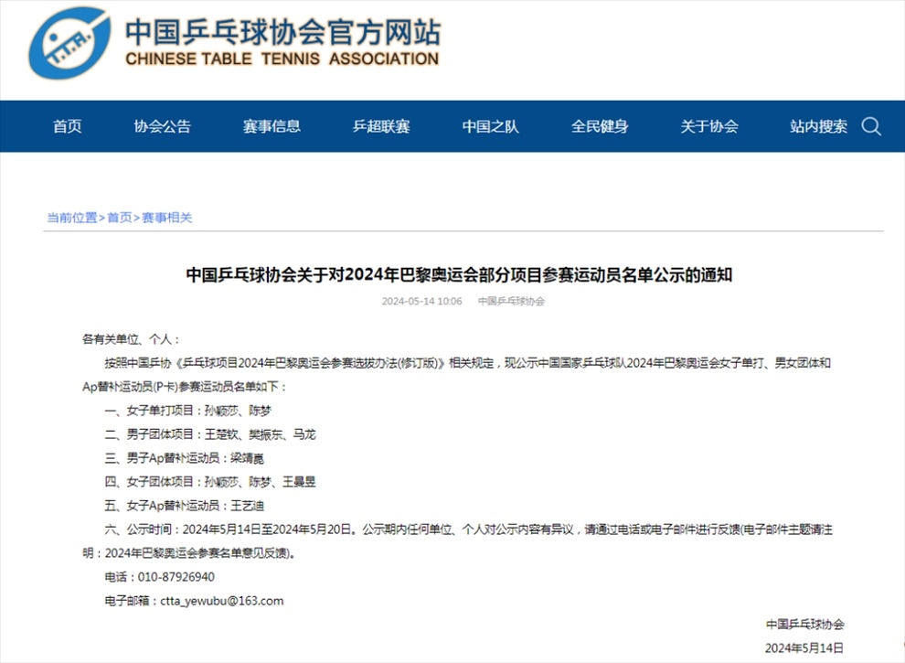 ·中國(guó)乒協(xié)公示巴黎奧運(yùn)會(huì)女單、男女團(tuán)參賽運(yùn)動(dòng)員名單。