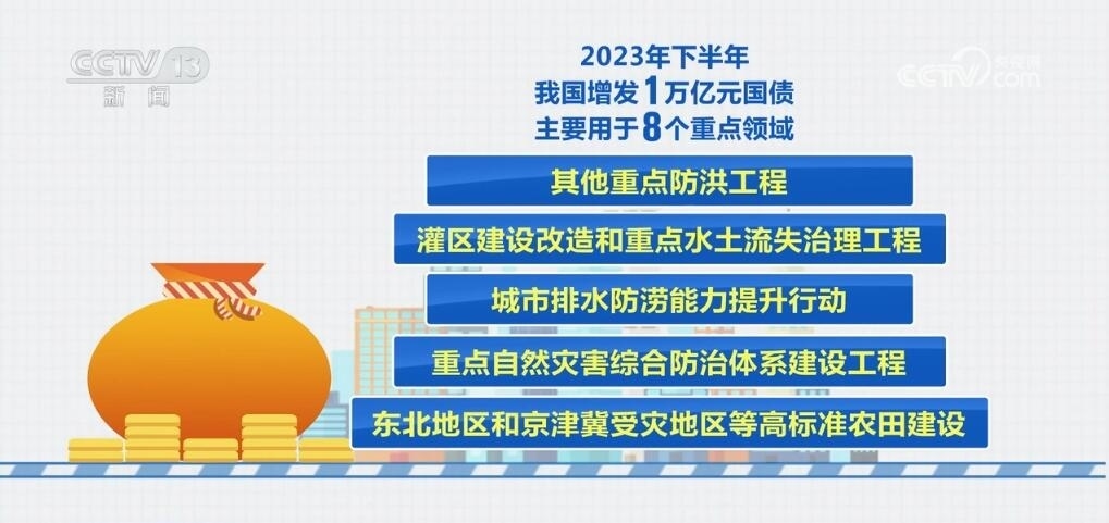 去年下半年,我國增發(fā)了1萬億元國債,主要用于8個(gè)重點(diǎn)領(lǐng)域,包括:災(zāi)后恢復(fù)重建,支持以京津冀為重點(diǎn)的華北地區(qū)等災(zāi)后恢復(fù)重建和提升防災(zāi)減災(zāi)能力,促進(jìn)災(zāi)區(qū)基本生產(chǎn)生活條件和經(jīng)濟(jì)發(fā)展恢復(fù)到災(zāi)前的水平;以海河、松花江流域等北方地區(qū)為重點(diǎn)的骨干防洪治理工程;自然災(zāi)害應(yīng)急能力提升工程;其他重點(diǎn)防洪工程;灌區(qū)建設(shè)改造和重點(diǎn)水土流失治理工程;城市排水防澇能力提升行動(dòng);重點(diǎn)自然災(zāi)害綜合防治體系建設(shè)工程;東北地區(qū)和京津冀受災(zāi)地區(qū)等高標(biāo)準(zhǔn)農(nóng)田建設(shè)。