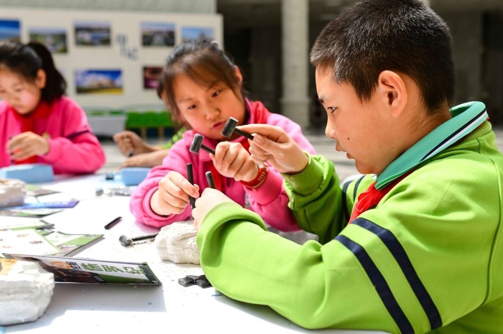 2024年4月22日,內(nèi)蒙古自治區(qū)鄂爾多斯市康巴什區(qū)實(shí)驗(yàn)小學(xué)在康巴什自然博物館開展“探索自然奧秘 保護(hù)地球家園”主題研學(xué)活動,這是學(xué)生在研學(xué)課程中體驗(yàn)尋找動物化石。