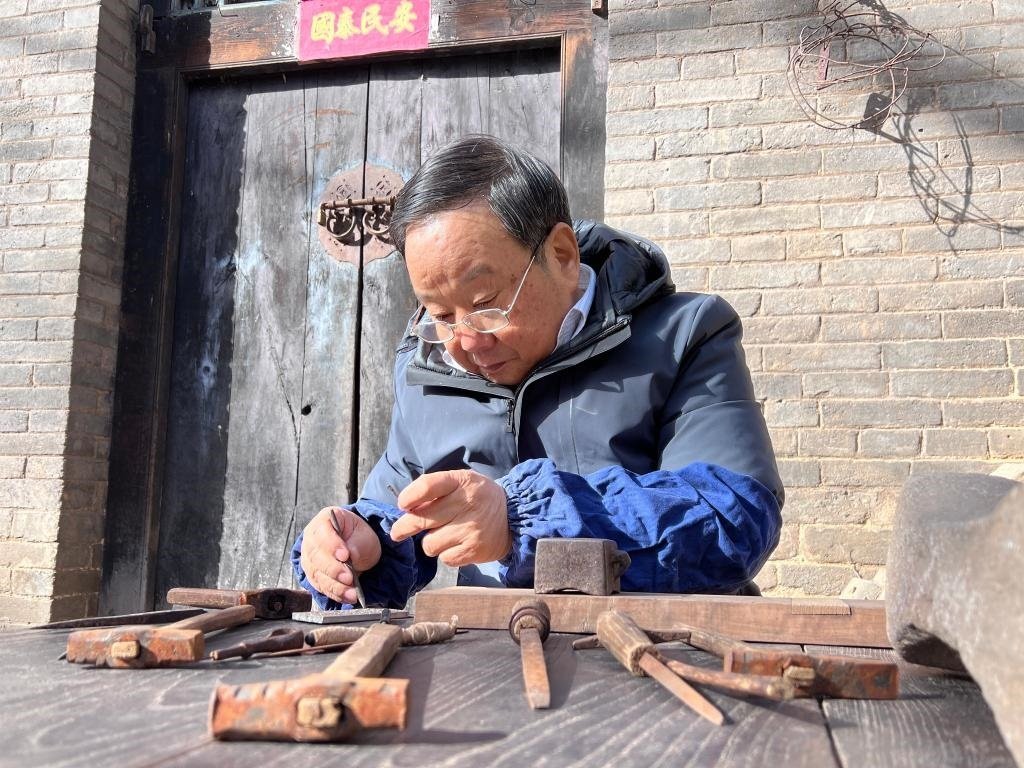 還沒進(jìn)門,院里就傳來“唿噠唿噠”的手拉風(fēng)箱聲,裴向南的老搭檔正忙著生火,一推一拉,火苗呼呼地竄起。一旁的裴師傅則不緊不慢地準(zhǔn)備著制針的工具。院落中央的老樹下,小木桌被熟練地支起,小錘、銼刀等一字排開、整齊碼放,足足有十幾件。“都是祖?zhèn)鞯膶氊?,用了好多年?!?/p>