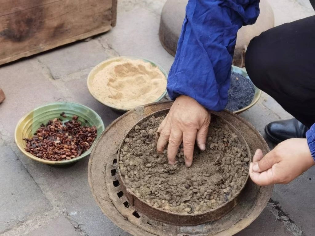 沖好針孔,便在磨石上反復(fù)銼尖。隨后倒入熱鍋里翻炒,再舀入一瓢水,針的剛性和硬度由此增加。接下來便輪到三大碗“大陽秘方”登場:白崖土粉末、松木炭和發(fā)酵后的豆豉,用于蒸針?!八赡咎靠梢栽黾愉撫樀暮剂?,提升硬度;豆豉增加亮度;白崖土粉末作為分散劑讓針受熱均勻。這樣處理后可以保證針質(zhì)更堅(jiān)硬又有光澤。”