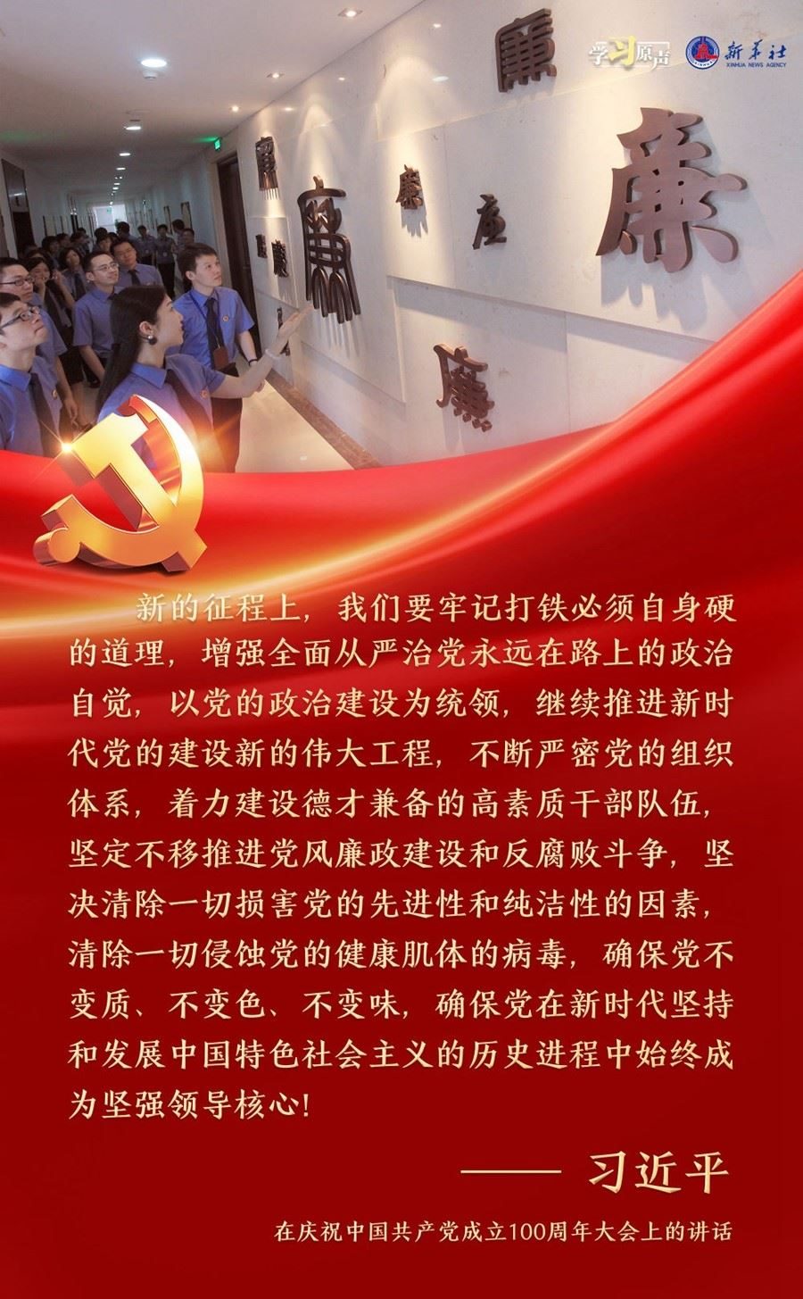 習(xí)近平總書記強(qiáng)調(diào),面對(duì)新征程上的新挑戰(zhàn)新考驗(yàn),我們必須高度警省,永遠(yuǎn)保持趕考的清醒和謹(jǐn)慎,馳而不息推進(jìn)全面從嚴(yán)治黨,使百年大黨在自我革命中不斷煥發(fā)蓬勃生機(jī),始終成為中國(guó)人民最可靠、最堅(jiān)強(qiáng)的主心骨。