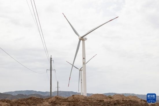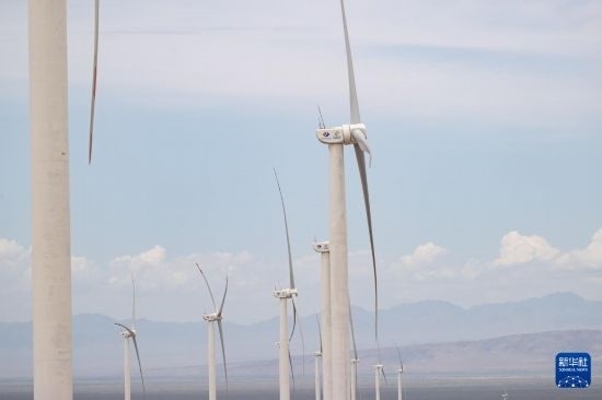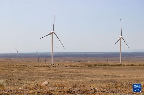 這是6月25日在哈薩克斯坦阿拉木圖州謝列克風(fēng)電場(chǎng)拍攝的風(fēng)機(jī)。白雪騏 攝