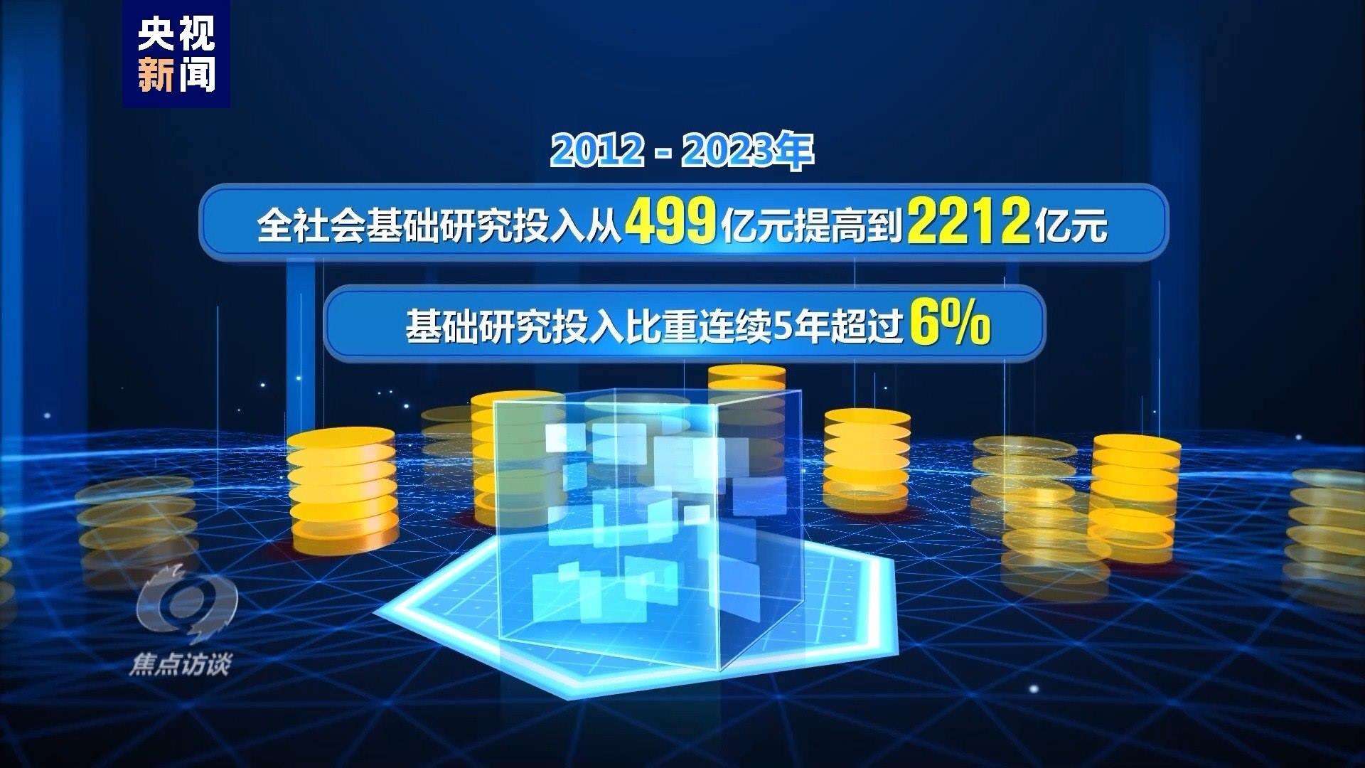 2012—2023年,全社會(huì)基礎(chǔ)研究投入從499億元提高到2212億元,基礎(chǔ)研究投入比重連續(xù)5年超過(guò)6%。