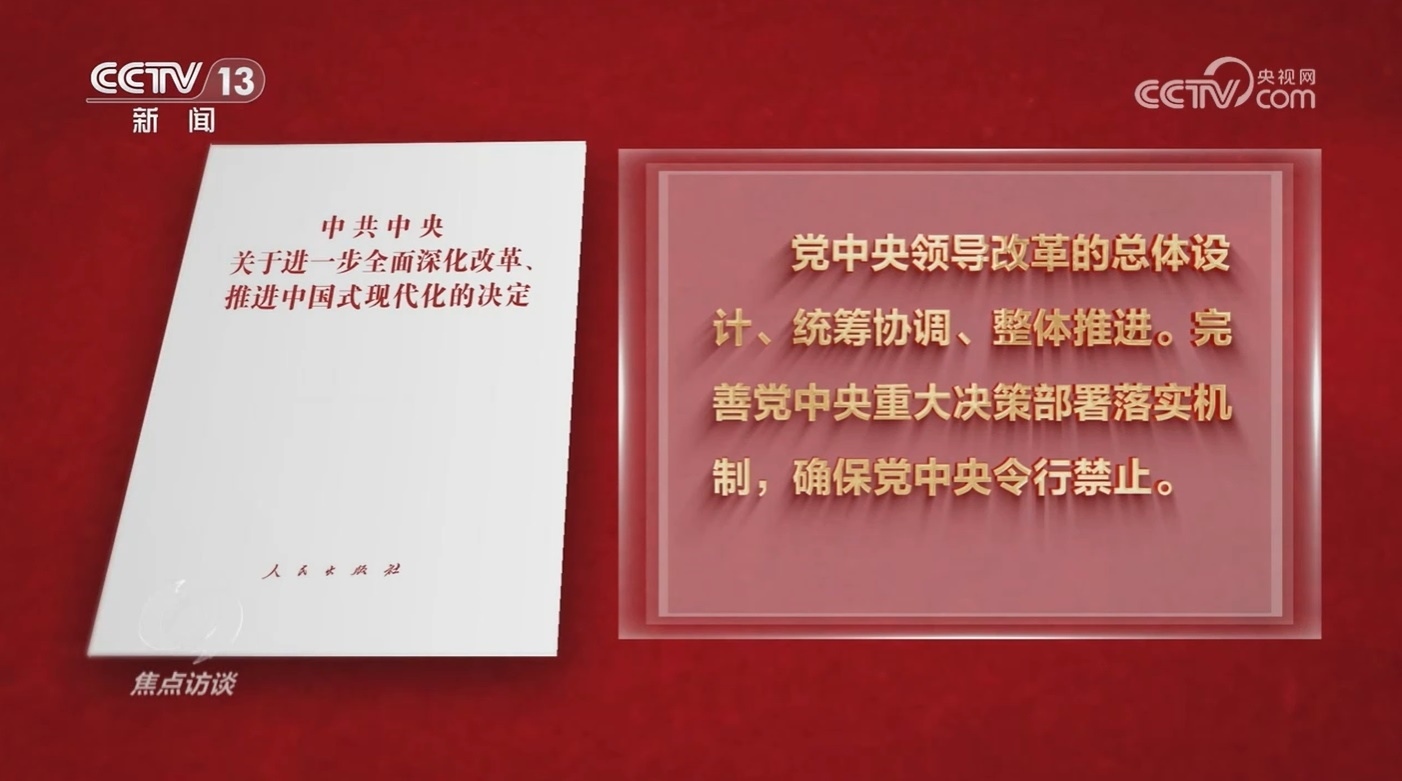 新征程上,如何提高黨對進一步全面深化改革、推進中國式現(xiàn)代化的領(lǐng)導(dǎo)水平?《決定》專門用一個部分來進行部署,并從三個方面作出具體安排,第一方面的重點是,堅持黨中央對進一步全面深化改革的集中統(tǒng)一領(lǐng)導(dǎo)。