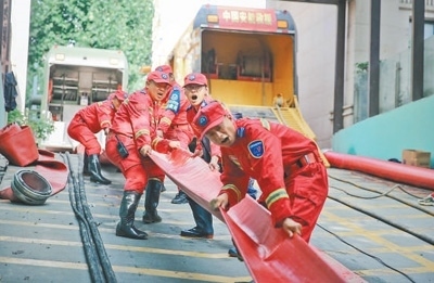 在安徽省合肥市瑤海區(qū),中國(guó)安能一局合肥救援基地排澇一組開(kāi)展城市內(nèi)澇排險(xiǎn)作業(yè)。劉溫馨 申屠建華攝影報(bào)道