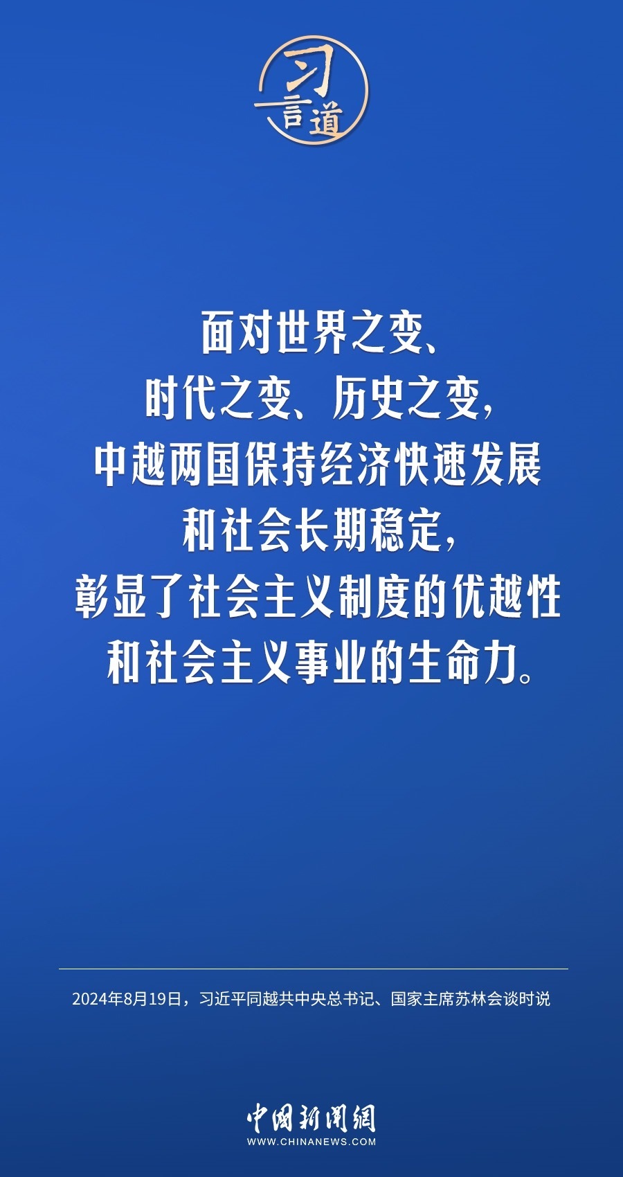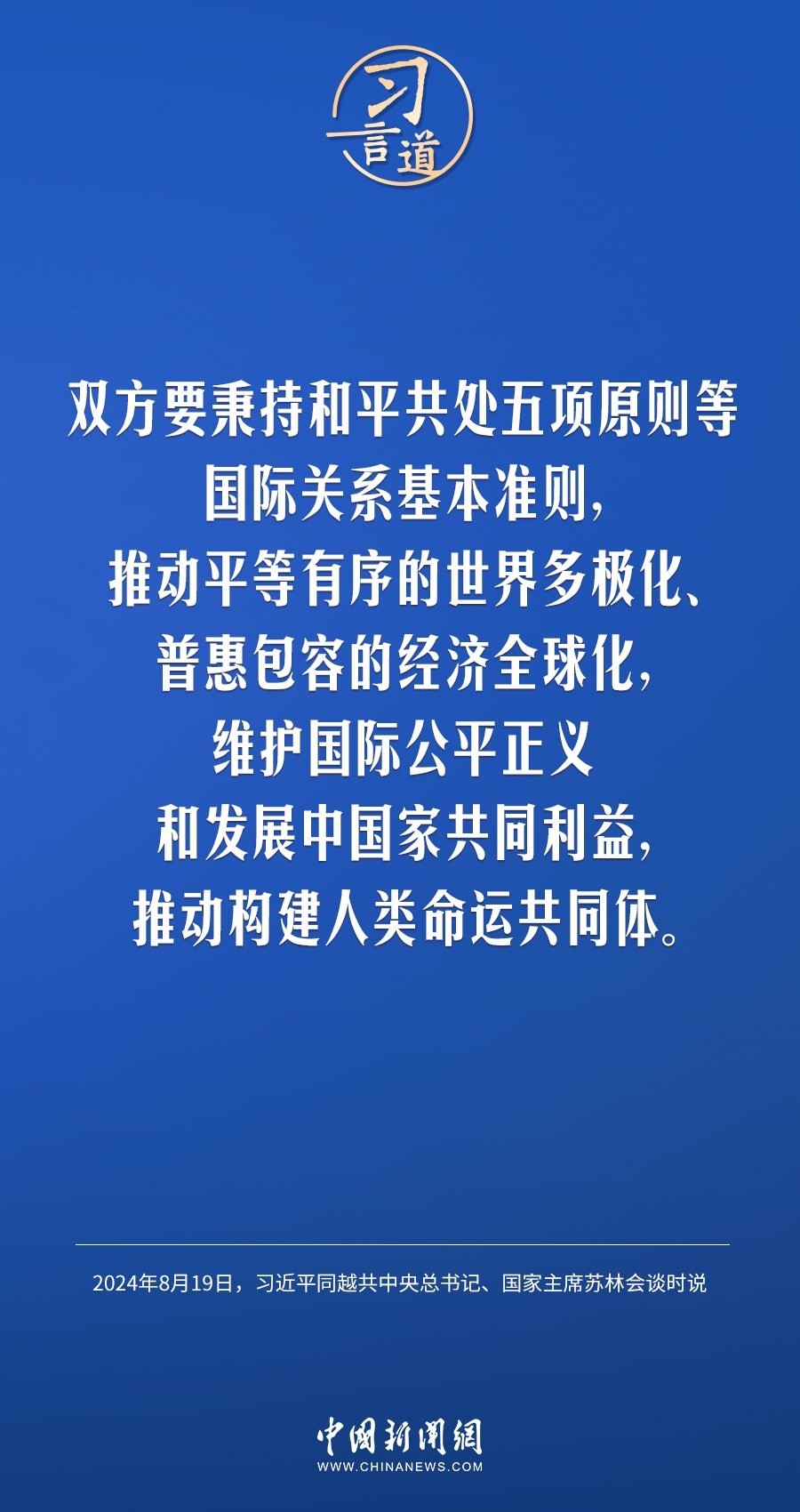 8月19日,中共中央總書記、國(guó)家主席習(xí)近平在北京人民大會(huì)堂同來(lái)華進(jìn)行國(guó)事訪問(wèn)的越共中央總書記、國(guó)家主席蘇林舉行會(huì)談。習(xí)近平指出——